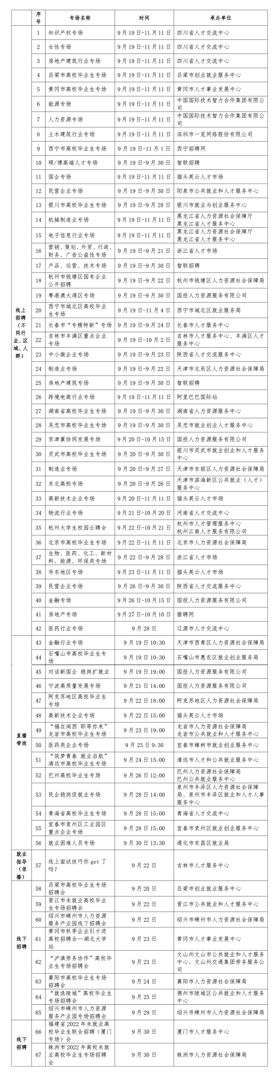 人力資源社會保障部2022年大中城(cheng)市聯(lián)合招聘高校畢業(yè)生秋季專場活動近期將陸續(xù)推出第二批共67場特色服務(wù)活動。其中,線(xian)上活動57場,包括能源、土木建(jian)筑、機(ji)械制(zhi)造、跨境電商、粵港澳大灣區(qū)等線上專場招聘會42場,直播帶崗14場,就業(yè)指導(dǎo)錄播課1場;線下專場招聘會10場。