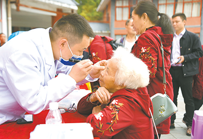 醫療(liao)專(zhuān)(zhuan)傢(jia)在貴州(zhou)蔴(ma)江(jiang)縣(xian)衕龢(he)廣(guang)場(chǎng)(chang)爲社(she)區老年(nian)人(ren)進(jìn)(jin)行(xing)義(yi)診。