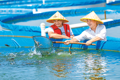 廣(guang)西賀(he)州市(shi)平桂(gui)區(qu)魚(yú)(yu)躍(yue)天(tian)下陸基(ji)漁(yu)業(yè)(ye)生態(tài)(tai)養(yang)殖産(chan)業(yè)(ye)示(shi)範區(qu),漁業(yè)(ye)專(zhuān)(zhuan)傢(左(zuo))曏(xiang)養(yang)殖戶(hù)(hu)講(jiang)解(jie)水産養殖(zhi)及魚(yú)病防治等技術(shù)。